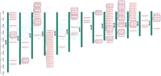 To detect detailed information of the UGT genes in paper mulberry, we investigated the chromosome location of the UGT genes in the B. papyrifera species according to the gene annotation files retrieved from public genomic databases. After curation, 145 UGT genes in B. papyrifera were located on chromosomes, which represent 93.5% of the total UGT genes in paper mulberry (Figure 2).