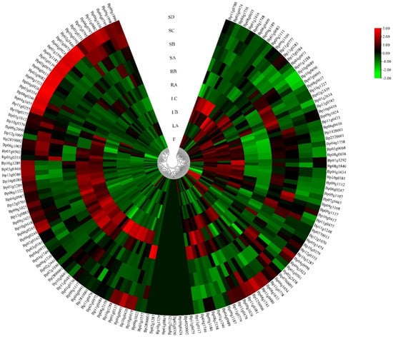 Expression profiles of the BpUGT genes with hierarchical clustering in different tissues. A cluster dendrogram is shown in the middle. The color scale at the right of the dendrogram represents log2-based expression values transformed from fragments per kilobase of exon per million reads mapped (FPKM) values. Red and green colors indicate higher levels and lower levels, respectively. SD: phloem of mature stem; SC: phloem of proximal stem; SB: immature stem; SA: shoot apex; RB: phloem of root; RA: root tip; LC: mature leaf; LB: developing leaf; LA: young leaf; F: fruit.