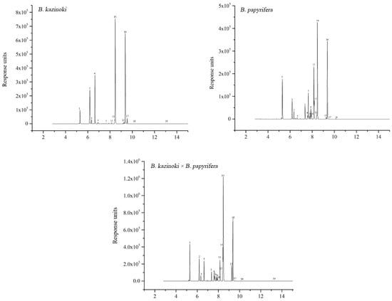 The UPLC elution profile of detected compounds from B. papyrifera, B. kazinoki and B. kazinoki × B. papyrifera leaves. The number of the peaks corresponds to that of the compounds in Table 1.
