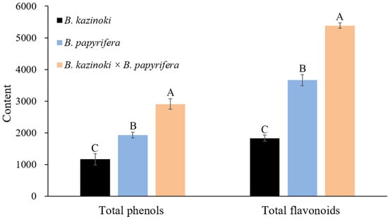 Total polyphenol content (TPC) and total flavonoid content (TFC) of leaf extracts from B. kazinoki, B. papyrifera and B. kazinoki × B. papyrifera. Letters above each pillar indicate significantly different values among samples according to ANOVA at p < 0.01. Values are mean ± SD (n = 3). Letters above each pillar indicate significantly different values among samples according to ANOVA at p < 0.01.