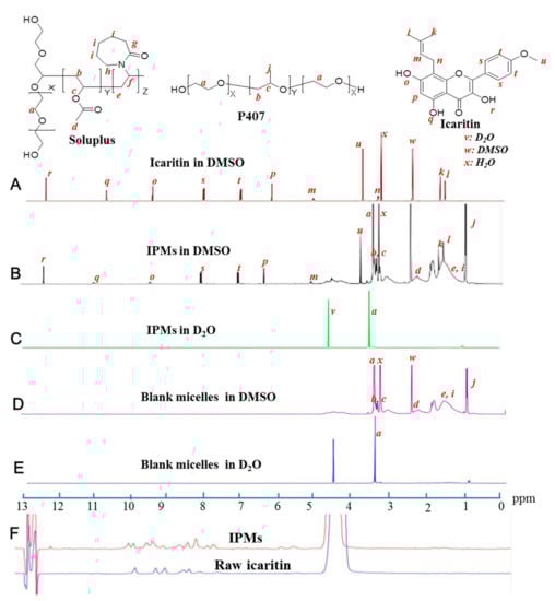 1H-NMR of icaritin in DMSO-d6 (A), IPMs in DMSO-d6 (B) and in D2O (C), and blank micelles in DMSO-d6 (D) and in D2O (E). (F) The HPLC chromatograms of raw icaritin and the loaded icaritin in the micelles. DMSO, dimethylsulfoxide; HPLC, high performance liquid chromatography; IPMs, icaritin-loaded polymeric micelles; P407, poloxamer 407.