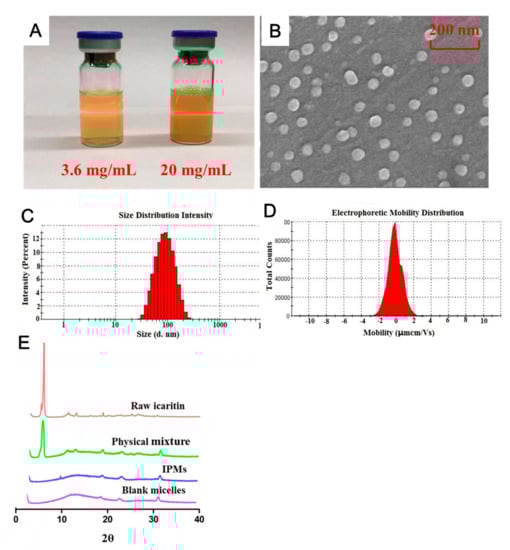 (A) Photographs of IPMs solutions containing 3.6 mg/mL icaritin (left) and 20 mg/mL icaritin (right). (B) The SEM images of IPMs. (C) Size distribution and (D) Zeta potential of IPMs. (E) The X-ray powder diffractogram of raw icaritin, blank micelles, physical mixture of icaritin and polymers, and IPMs. IPMs, icaritin-loaded polymeric micelles; SEM, scanning electron microscope.