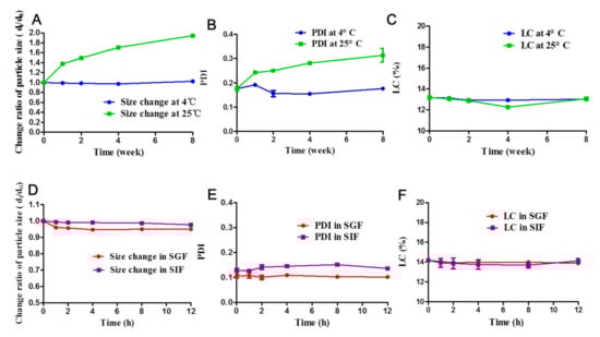 The stability of the IPMs in simulated gastric fluid (SGF) and simulated intestinal fluid (SIF) was also assessed based on the changes in the particle size and the PDI and LC of the micelles over time during their incubation in SGF and SIF, under shaking at a speed of 100 rpm at 37 °C. The particle size and PDI, and LC were determined at 1, 2, 4, 6, and 12 h, as described earlier.