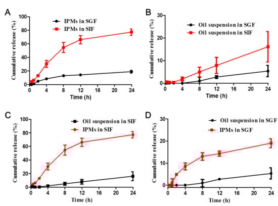 In vitro release of icaritin from IPMs in SIF and SGF was investigated by dialysis. A dialysis membrane with MWCO 3500 was used to make sure that the release kinetics of icaritin with molecular weight of 368 rather than the membrane-restricted diffusion of icaritin in SGF and SIF was determined under sink conditions []. The accumulative release of icaritin as a function of time was plotted in Figure 5. About 19.02 ± 2.03% and 77.28 ± 4.70% of icaritin was released from IPMs within 24 h in SGF and SIF (Figure 5A), respectively, compared to 5.35 ± 2.50% and 16.12 ± 6.71% of icaritin released from the oil suspension (Figure 5B), indicating greatly enhanced and sustained release of icaritin from the polymeric micelles. These might be attributed to the solubility enhancement of icaritin by encapsulation in micelles, and is advantageous for bioavailability improvement after oral administration []. Additionally, both the IPMs (Figure 5C) and the oil suspension (Figure 5D) showed a faster release profiles in SIF than in SGF. A possible explanation for such phenomenon might be the better solubility of icaritin in the basic condition.
