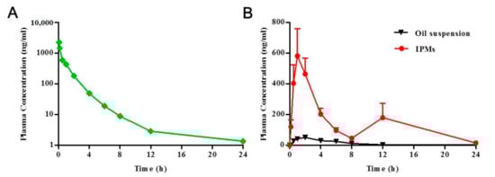 Mean plasma concentration of icaritin versus time profiles following a single injection of icaritin solution at a dose of 2 mg/kg (A), and oral administration of IPMs and oil suspensions at a dose of 20 mg/kg (B) to beagle dogs. IPMs, icaritin-loaded polymeric micelles.