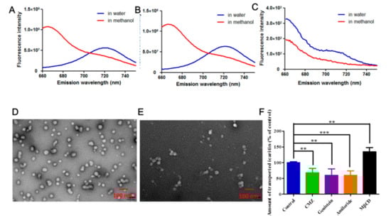 The integrity of the micelle structure after their transcytosis transport was identified using the FRET method []. In brief, the donor Cy5 and the acceptor Cy5.5 were first conjugated with icaritin to obtain fluorophore-labelled icaritin-Cy5 and icaritin-Cy5.5 (Supplementary Materials Figure S1), respectively. Icaritin, icaritin-Cy5 and icaritin-Cy5.5 were encapsulated in the micelles as described earlier to yield FRET micelles. To examine the existence of FRET, the fluorescence spectrum of FRET micelles in water and in methanol was recorded at an excitation wavelength of 635 nm, with microplate reader (SpectraMax i3, Molecular Devices, San Jose, CA, USA). The emission was scanned from 660 to 750 nm.