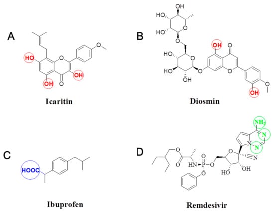 Structure of icaritin (A), diosmin (B), ibuprofen (C) and remdesivir (D).