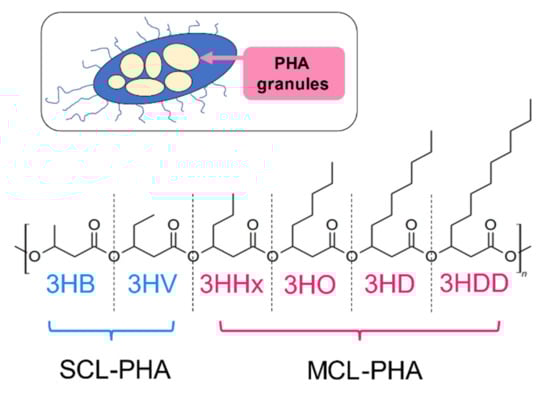 Polyhydroxyalkanoates (PHAs) are a class of biopolymers produced as intracellular energy/carbon storage materials that also possess versatile material properties. PHA was first discovered in Bacillus megaterium as granular inclusion bodies by the French scientist Lemoigne. Later these granular bodies were extracted and identified as poly (3-hydroxybutyrate) (PHB) []. PHAs remain of high interest as potential substitutes to conventional plastics in numerous fields of application due to their widespread applicability in various fields such as food packaging, agriculture, tissue-engineering scaffolds, bioresorbable implants and for drug delivery []. To date, various PHAs and their copolymers have been isolated from different bacterial species. More than 150 constituent repeat units have been reported to have been incorporated as PHA units along chains [,]. The monomer composition of PHAs can be altered so that the polymers have tailored physicochemical and mechanical properties [].