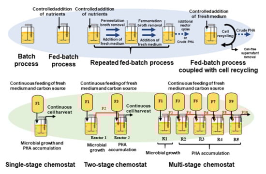The productivity of PHAs is dependent on many factors such as the bacterial strain, carbon/nitrogen ratio, pH, temperature, cultivation time, and presence of micro and macro nutrients []. For optimization of PHA yield, different fermentation strategies such as batch, fed-batch and continuous processes have been used. Figure 4 provides a diagram of the overall PHA production pathway with options of alternative processes. Fermentation processes can be separated into two categories: continuous or discontinuous processes. The upper half of the figure illustrates discontinuous processes: batch fermentations, repeated fed-batch and fed-batch coupled with cell recycling. The bottom half of the figure illustrates continuous processes: single-stage chemostat, two-stage chemostat and a multi-stage bioreactor cascade. Unlike batch fermentations, continuous processes maintain static fermentation parameters. The use of multi-reactor fermentation strategies, especially multi-stage cultivation systems, are recommended to obtain high yields of PHA. R1–R5: Five continuous stirred tank reactors. F1, F3, F5, F7 and F9: Feed streams for supply of nutritional medium to the bioreactors R1, R2, R3, R4 and R5, respectively. F2, F4, F6 and F8: Continuous transfer of fermentation broth to the subsequent reactors. F10: Outlet stream containing final product. Microbial cell growth occurs in R1, whereas PHA accumulation takes place in R2–R5.