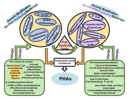 Non-PHA producing organisms can be genetically modified to biosynthesize PHAs (Figure 5). Furthermore, genetic modification of PHA and non-PHA producing strains provides a route to recombinant strains with improved kinetics for PHA production, a wider ability for substrate utilization (e.g., utilization of lignocellulose components), and changes in selectivity enabling the production of PHAs with unique structures. In addition, genetic engineering of strains has been used to improve substrate utilization from, for example, treated lignocellulose materials. In some cases, recombinant strain construction of, for example, C. necator and E. coli and are considered as strong candidate for commercial PHA production [,].
