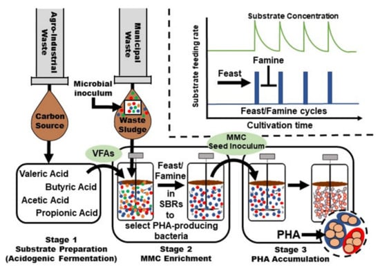 There are two types of fed-batch cultivations: product formation that is either growth-associated or that occurs under non-growth-associated conditions. PHA production is usually carried out in two phases, first, the growth phase is conducted such that cells reach the desired biomass. Polymer production occurs in the second phase in which all essential nutrients required for production are fed to the bioreactor []. In most cases, the second phase is conducted where an essential nutrient, such as phosphorus, nitrogen, oxygen and sulfur, is at a limiting concentration such that metabolic pathways supporting growth are suppressed and the cells respond by focusing their efforts on PHA accumulation to store carbon and energy. Fed-batch cultivations must have suitable strategies to supply carbon sources and other nutrients. Under circumstances where a carbon source for PHA becomes limiting, the rate of PHA degradation via a PHA depolymerase increases.