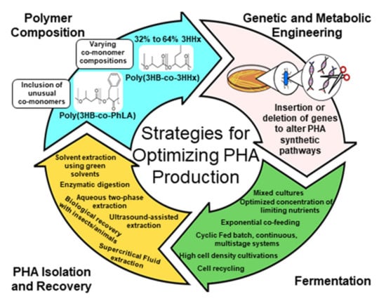 A major bottleneck in the commercialization of PHAs is the high cost of production where metrics such as carbon conversion yield (g/g), titer or volumetric yield (g/L) and productivity (g/L/h) are critically important []. In addition to production metrics, low cost downstream processing methodologies and PHA manufacturing that meets cost-performance requirements have remained challenging. This has inspired researchers to work towards increasing PHA fermentation and downstream processing efficiency to reduce the overall cost [,,,].