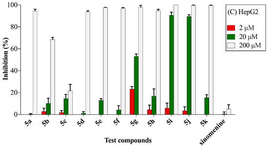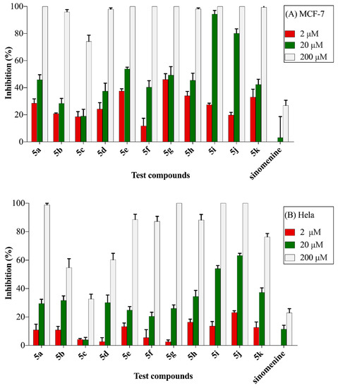 The in vitro growth inhibitory activity of the sinomenine derivatives (5a–5k) was evaluated against different three cell lines, MCF-7, Hela, and HepG2, using sinomenine as the reference compound kept under the same conditions in an MTT assay [19]. The inhibition ratios of synthetic compounds were determined at concentrations of 2, 20 and 200 μM. The obtained data in triplicate for each concentration were plotted, as shown in Figure 2.