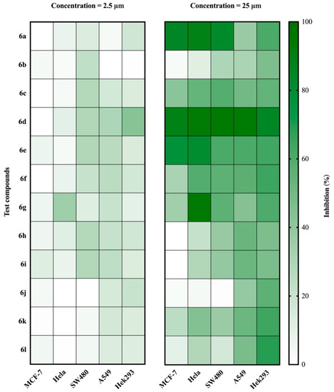 The MCF-7 (human breast cancer cell lines), Hela (human cervical cancer cell lines), SW480 (human colon adenocarcinoma cell lines), A549 (human lung adenocarcinoma cell lines) and nontoxic normal cells Hek293 (human embryonic kidney cell lines) cells were used to measure the cytotoxicity of the 6a–6l. They were obtained from the Beijing Normal University (Beijing, China). The test cell lines were cultured in DMEM, IMDM, F12 and DMEM nutrient medium containing 10% heat-inactivated fetal bovine serum, 100 mg/mL streptomycin and 100 units/mL penicillin in a humified, 5% (v/v) CO2 atmosphere at 37 °C.