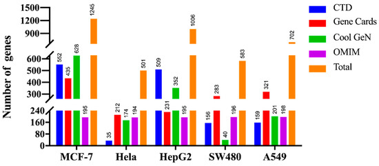 The candidate genes of the five cell-line-related diseases viz. MCF-7 (1245 genes), Hela (501 genes), HepG2 (1006 genes), SW480 (583 genes) and A549 (702 genes), were searched, and duplicates were removed through a series of databases (Figure 4).
