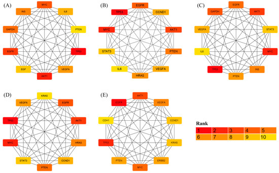 Five cancer disease-related protein interaction networks constructed by Cytoscape. Each network has 10 nodes with the top 10 degrees. (A) Breast cancer-related genes, (B) cervical cancer-related genes, (C) hepatocellular cancer-related genes, (D) colonic cancer-related genes, and (E) lung adenocarcinoma-related genes.