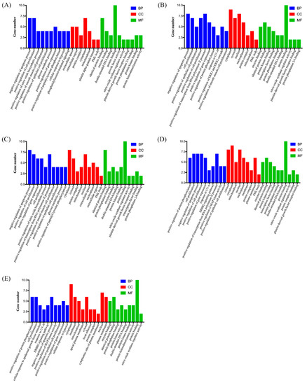 Gene ontology terms of top 10 targets of five cancer diseases (p-value < 0.05). BP, MF, and CC represent Biological Process, Molecular Function, and Cellular Component groups of GO, respectively. (A) Breast cancer, (B) cervical cancer, (C) hepatocellular cancer, (D) colonic cancer, and (E) lung adenocarcinoma.