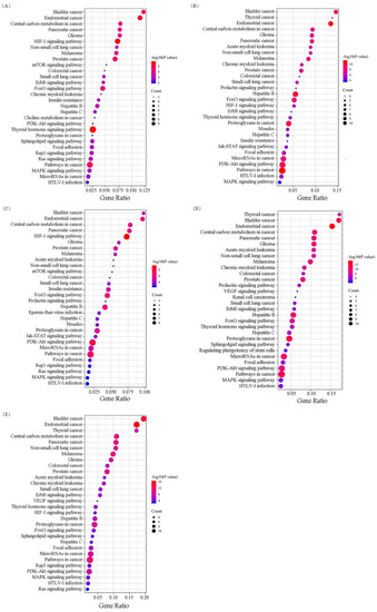 Bubble plot of KEGG pathway enrichment analysis of the genes related to the five cancer diseases. Bubble plot: letters on the left are KEGG names, numbers on the bottom are the proportions of genes, sizes of the circles indicate the numbers of enriched genes, and colors reflect p-values. The redder the colors are, the more enriched the genes, and the smaller the p values. (p is normalized according to −log10). (A) Breast cancer, (B) cervical cancer, (C) hepatocellular cancer, (D) colonic cancer and (E) lung adenocarcinoma.