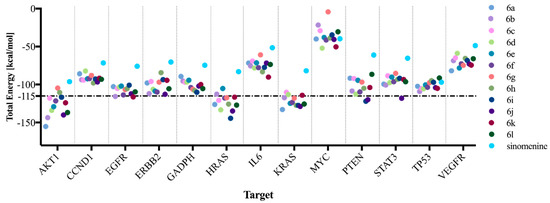 The total energy of molecular docking between compounds 6a–6l and 13 potential targets.