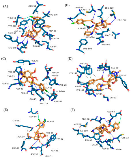 The binding pose of the selected ligands. (A) 6e docked into the binding cavity of the protein AKT1; (B) 6d docked into the binding cavity of the protein EGFR; (C) 6a docked into the binding cavity of the protein HRAS; (D) 6e docked into the binding cavity of the protein HRAS; (E) 6g docked into the binding cavity of the protein HRAS; (F) 6a docked into the binding cavity of the protein KRAS. The ligand is represented by orange sticks. The active site residues are shown as blue sticks. The main atoms involving hydrogen bonds are indicated by blue lines. The main atoms involving hydrophobic bonds are indicated by grey dashes. The main atoms involving halogen bonds are indicated by green lines. The main atoms involving salt bridges are indicated by yellow dotted lines. The main atoms involving π-stacking are indicated by green dotted lines. The key residues participating in hydrogen bonds and hydrophobic interactions are labeled.