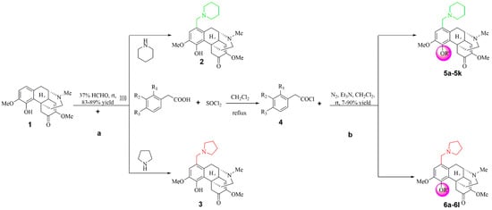 Many scholars have reported the structural modification of the sinomenine A ring. Due to the good application effect of piperidine and tetrahydropyrrole in medicine, we took sinomenine as the leading compound and introduced piperidine methylene or tetrahydropyrrole methylene at C1 by Mannich reaction to obtain 1-piperidine methylated sinomenine (5a–5k) and 1-tetrahydropyrrole methylated sinomenine (6a–6l) [18]. As the phenolic hydroxyl group of C4 is easy to oxidize and decompose and may be a factor leading to allergic reactions in vivo, it is necessary to modify the structure to protect the phenolic hydroxyl group. Esters are important intermediates of organic synthesis. The phenol hydroxyl ester can not only increase liposolubility, enhance substance activity and change metabolic characteristics, but it can also slow down the oxidation rate of compounds and greatly reduce their allergic reactions. Therefore, a series of 1,4-bisubstituted sinomenine derivatives were synthesized by the reaction of phenylacetyl chloride with 1-tetrahydropyrrole methylated sinomenine. All structures of the products were determined by IR, 1H-NMR, 13C-NMR, and HRMS.