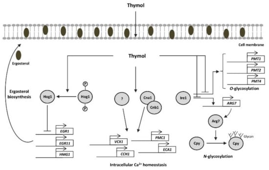- Chaillot, J.; Tebbji, F.; Remmal, A.; Boone, C.; Brown, G.W.; Bellaoui, M.; Sellam, A. The Monoterpene Carvacrol Generates Endoplasmic Reticulum Stress in the Pathogenic Fungus Candida albicans. Antimicrob. Agents Chemother. 2015, 59, 4584–4592. [Google Scholar] [CrossRef] [PubMed]
