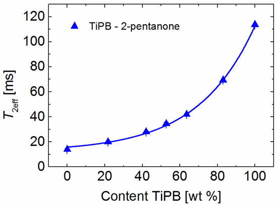 Correlation of the relaxation times with the solvent content in a binary mixture as exemplarily shown for TiPB/2-pentanone. The line depicts the fit result using the equation T2eff_mixture = 3.72 × exp(content/30.3) + 12 with a correlation factor higher than 0.99. The relaxation times were measured at room temperature.