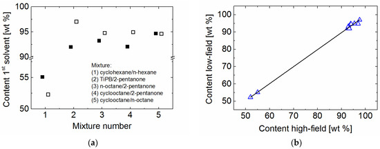 All solvents investigated in this study (2-pentanone, n-hexane, cyclohexane, n-octane, cyclooctane, and 1,3,5-triisopropylbenzene (TiPB)) were purchased from Sigma-Aldrich (Germany). Different binary mixtures of the mentioned solvents (cyclooctane/n-octane, cyclooctane/2-pentanone, n-octane/2-pentanone, n-hexane/cyclohexane, and TiPB/2-pentanone) were then prepared by mixing the two solvent components at different mass proportion with a help of a syringe. Due to possible evaporation issues during the preparation of the mixture, the estimated mass proportion was controlled by 1H high-field liquid-state spectroscopy measurements. The binary mixtures were sealed in a glass container in order to keep the concentration constant during the NMR measurement.
