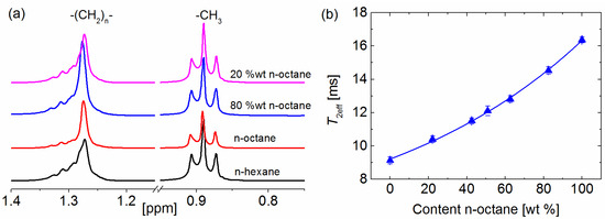 The quantified mass proportions of all mixtures by low-field relaxometry approach show an excellent agreement with the results from liquid-state 1H spectroscopy. Proton NMR spectroscopy is another method which can be used to easily quantify the content of certain solvents in a mixture without the need of an a priori calibration or the use of advanced data analysis but requires more sophisticated equipment and for complicated solvent structures measurements at high-magnetic field. Furthermore, the spectra alone fail to give the needed information when applied to certain mixtures including linear alkanes as, for example, for n-hexane/n-octane (Figure 5a). The identical appearance of the spectra of the pure solvents and their mixtures prevents the quantification of the solvent content inside the mixture using solely the differences in the chemical shift of the functional groups. A differentiation between the two solvents and their mixtures can however very easily be achieved with relaxation measurements under the experimental conditions already described (Figure 5b).