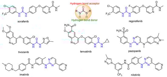 Compared with earlier targeted drugs, multi-target inhibitors can act on a variety of different targets and inhibit different signal pathways at the same time [6,8,9]. The multi-target inhibitors have a broader anti-tumor spectra and better prospects in clinical practice [7]. Urea and urea isosteres are structures that possesses both a hydrogen bond acceptor and a hydrogen bond donor, which makes it easy to form better interactions with drug target proteins [10]. These kinds of structures are an excellent pharmacodynamic structure in drug molecules [11]. In many small-molecule targeted kinase inhibitors, urea and urea isosteres, including aminopyrimidine, have been used in drug structures, some of which showed really favorable anti-cancer activity (Figure 1) [12,13].