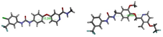 Figure 2. Spatial distance of the two nitrogen atoms in pyridine ring and urea moiety of sorafenib (left) and a target compound (right).