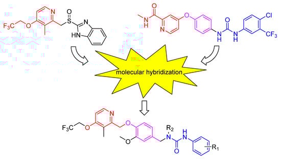 Furthermore, in previous reports, some proton pump inhibitors showed anticancer activity; lansoprazole was one of the drugs that performed well [19,20]. Based on the molecular hybridization and structural optimization strategies, the 3-methyl-4-(2,2,2-trifluoroethoxy)pyridin-2-ylmethyl moiety in lansoprazole and the N-aryl-N’-benzylurea scaffold were retained into the target compounds (Figure 3) [21]. Considering the extra space in some intracellular protein serine/threonine kinases such as BRAF kinase binding with sorafenib, a new series of N-aryl-N’-benzylurea derivatives modified with a 1-methylpiperidin-4-yl group on the 3-position of the urea scaffold were designed, which are expected to block intracellular signal transduction and enhance their antiproliferative activity [22,23].