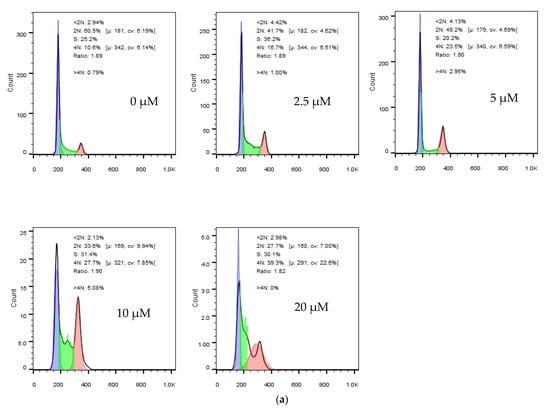 As for the flow cytometric analysis of DNA content, 1 × 105 MCF-7 cells in exponential growth were treated with different concentrations of compound 9b for 24 h. After an incubation period, the cells were collected, centrifuged, and fixed with ice-cold ethanol (70%). The cells were then treated with buffer containing RNAse A and 0.1% Triton X-100 and then stained with the propidium iodide (PI). The samples were analyzed on a flow cytometer (Becton, Dickinson, Franklin Lakes, NJ, USA) [28]. Data were analyzed using Flowjo software v9.0.