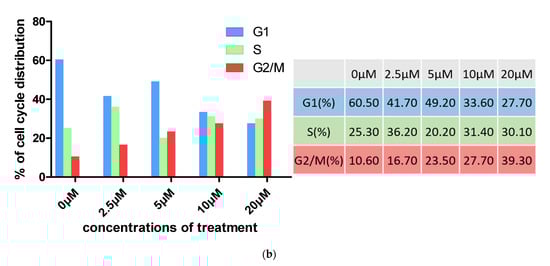 Figure 4. Effects of compound 9b on MCF7 cell cycle progress for 24 h. (a) Treatment of MCF7 cells with compound 9b at different concentrations (0 μM, 2.5 μM, 5 μM, 10 μM, 20 μM) for 24 h. (b) Quantitative analysis of cell cycle.