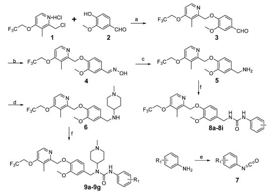As shown in Scheme 1, the target molecules were synthesized starting with 2-(chloromethyl)-3-methyl-4-(2,2,2-trifluoromethoxy)pyridine hydrochloride (1) and vanillin (2) via a Williamson reaction and obtained the ether compound 3, which reacted with hydroxylamine to convert the oxime 4. The oxime 4 was reduced by Ni-Al to obtain benzylamine 5. The reaction between benzylamine 5 and 1-methylpiperidin-4-one through reductive amination yielded the key intermediate 6. Finally, the different intermediate isocyanate 7, prepared by a reaction between substituting aniline or benzylamine, triphosgene, and TEA, were mixed with compound 5 or compound 6 to yield the targeted compounds 8a8i and 9a9g.