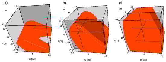 Design Spaces in the 3D models. The irregular red zones indicate the Design Spaces of the UHPLC-method, where the critical resolution is higher than 2.0. (a) = 1.5 min; = 4.5 min/ = 20 C; = 80 C/pH = 2.8; pH = 4.0; pH = 5.2; (b) = 1.5 min; = 4.5 min/ = 20 C; = 50 C/pH = 2.8; pH = 4.6; pH = 6.4; (c) = 2.0 min; = 4.0 min/ = 35 C; = 45 C/pH = 5.8; pH = 6.0; pH = 6.4.