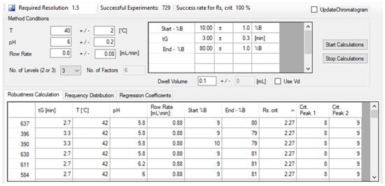 A virtual robustness testing was performed using the robustness module of DryLab. In addition to the three measured model parameters (, T, pH), the flow rate, the initial %B composition, and final %B compositions of the mobile phase gradient were introduced as calculated parameters and included in the model (6 parameters in total). The effects of these 6 parameters are calculated, optionally at 2 or 3 levels. In our case, we studied them at 3 levels.