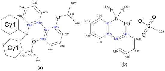 Assignment of the signals specified by their chemical shifts of 1H (black) and 13C (blue), of coordinated RuPhos in RuPhos Pd G3 (a), ABP− fragment in RuPhos Pd G3 (b), coordinated XPhos in XPhos Pd G3 (c) and NH2-group of ABP in XPhos Pd G3 (d), based on 1D and 2D NMR experiments in DMSO-d6.