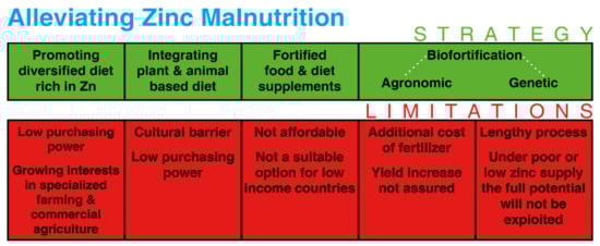 Considering the importance of Zn in human health (Table 1), there is a growing interest in improving Zn nutrition. Strategies are being made to improve Zn intake among humans to improve the bioavailability of the Zn [30,31,32]. Bioavailability refers to the fraction of Zn intake that can be absorbed in the human gut [33]. Thus, not only Zn intake but also its bioavailability should be given equal importance for improving Zn nutrition [7,11]. The bioavailability of Zn can be improved by reducing the anti-nutrition factor-like phytate in the grain [15]. The people in developing countries where the diet is dominated by cereals are subjected to micronutrient malnutrition disproportionately, since cereals are not only a poor source of micronutrients but also the high content of phytate in cereals reduces the bioavailability of Zn further [33,34].