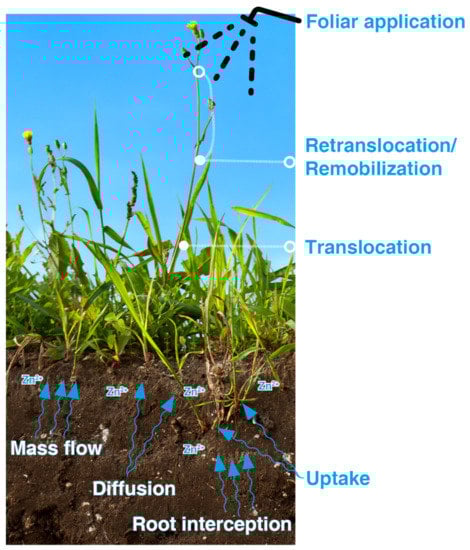 Understanding the physiological basis of micronutrient accumulation in the grains is of utmost importance for successful biofortification. Micronutrient concentration in the edible portion of the crop is decided by nutrient availability to plants and the process of absorption, translocation, and redistribution of micronutrients in the plant, which are being regulated by homeostatic mechanisms that allow accumulation of micronutrients in an adequate amount, yet at a non-toxic level [9,16]. The absorption of nutrients by the plant depends on soil factors, e.g., the physicochemical and biological properties of soil, agronomic factors, or management factors, that decide micronutrient availability at rhizosphere and plant factors such as root morphology, root cell activities leading to increased micronutrient solubility and mobility [10,18,48]. All these factors are in a close and complex interaction with each other that decides micronutrient absorption by plants. The agronomic practices like organic matter addition, micronutrient fertilizer application, maintaining optimum soil moisture for facilitating Zn diffusion to plant roots can help in increasing micronutrient absorption by plant roots [18].