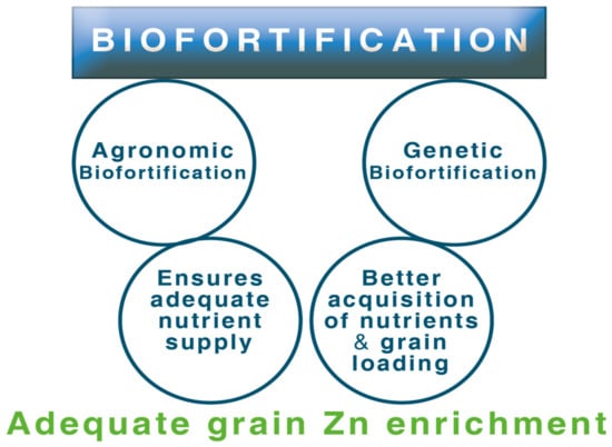 Low-income countries largely trust staple foods while relying less on fruits, vegetables, and foods from animal sources compared to high-income countries. Micronutrient malnutrition, due to a lack of sufficient micronutrients in the diet results in serious but often invisible health consequences, referred to as hidden hunger. In the world, over 2 billion people are affected by micronutrient deficiency [6,7]. This micronutrient malnutrition can be attributed to consumption of a diet having low micronutrient content and low dietary diversity. Hidden hunger can be addressed through a nutrition-specific and nutrition-sensitive approaches [8]. The nutrition-specific approach or direct approach involves dietary interventions, i.e., consuming a more diversified diet, micronutrient supplements, and fortification. The nutrient-sensitive approach, on the other hand, involves the biofortification approach (Figure 1) [9]. Biofortification refers to the process of increasing the concentration and/or bioavailability of nutrients in the edible part of plants. Enhancing micronutrient concentration in the staples can be a sustainable and cost-effective intervention in improving the micronutrient uptake by people [10,11,12,13]. The most common source of food among people, especially in low incoming countries are cereal-based diets [14,15]; therefore, enriching them with micronutrients can improve micronutrient consumption. Staple food grains like wheat, rice, maize, etc. are consumed by a large number of people across the globe, when they are biofortified with Zn it could have a great impact in reducing hidden hunger.