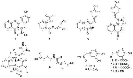 The remaining compounds were identical to 2-(4-hydroxybenzyl)quinazolin-4(3H)-one (3) [17], penipanoid A (4) [18], oxaline (5) [19], fuscoatramide (6) [20], 3,4-dihydroxybenzeneacetic acid (7) [21], 3,4-dihydroxyphenylacetic acid methyl ester (8) [21], phenylacetic acid (9) [22], 4-hydroxybenzeneacetamide (10) [23], 4-hydroxy phenylacetic acid methyl ester (11) [24], and 4-hydroxyphenylacetonitrile (12) [23] based on comparisons of their NMR data (Figures S13–S32) and specific rotations with those reported in the literature.