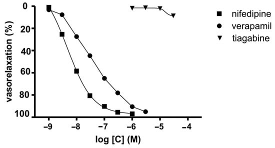 During the course of our study, we investigated the calcium entry blocking properties of TGB in vasculature by employing the isolated rat aorta contracted with depolarizing KCl solution. In this experiment, the KCl-induced contraction was caused by an increase in extracellular potassium that leaded to membrane depolarization, which increases calcium influx from extracellular sources involving voltage-dependent calcium channels [34] (Cav1.2). The reference compounds we used were verapamil [35] and NFD [36]. TGB was not able to relax KCl-precontracted aortic rings at the range of concentration 1–30 μM (Figure 1). At a higher concentration, TGB was not tested as it precipitated in Krebs–Henseleit solution. NFD, verapamil and voltage-dependent calcium channel blockers relaxed KCl (60 mmol/L)-precontracted aortic rings in a dose-dependent manner (Figure 1) by 95–97%, with the IC50 values of 4.7 ± 0.2 nM and 32.9 ± 7.4 nM, respectively [35,36]. On the basis of these results, we may state that TGB does not possess voltage-dependent calcium channel blocking properties at the tested range of concentrations.