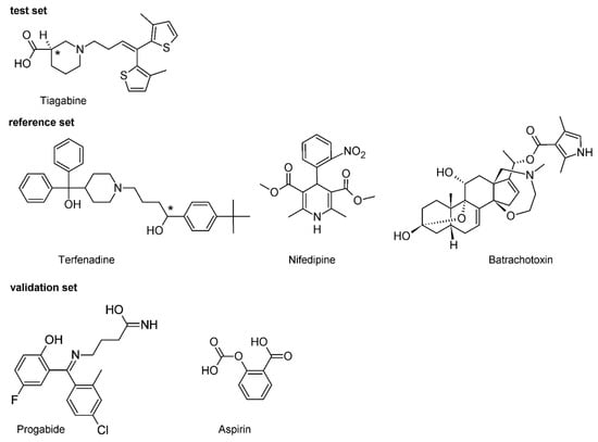 The validation was carried out by the docking of molecules with no affinity to hNav1.5, hCav1.2 and hKv11.1 channels, such as progabide (PRG) [50,51] and acetylsalicylic acid (ASA) [52]. This choice of PRG and ASA was made based on their chemical and biological similarity to TGB (ATC code: N03AG06 [53]). PRG (ATC code: N03AG05 [53]) is a first-generation antiepileptic drug without analgesic properties [12,54]. ASA (ATC code: N02BA01 [52]) is a classical and peripherally-acting nonsteroidal anti-inflammatory drug that is inactive at GAT and recommended for the prevention of several cardiovascular diseases due to its antiplatelet activity [52].