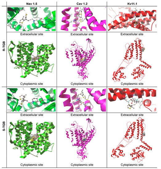 As it can be seen from the data collected in Table 2, TGB complexes between hNav1.5, hCav1.2 and hKv11.1 have a calculated pKi ≤ 4, which is commonly used as a threshold and this drug can thus be considered as an inactive ligand for those proteins. These data refer to both R/S enantiomers of TGB (Figure 3). Docking TGB into the hNav1.5 channel showed the highest pKi value in Table 2, however, the value is still below the activity threshold level of pKi > 4. The lowest pKi was observed for hKv11.1. We can treat these data as a partial explanation of the reported adverse TGB interactions in the cardiovascular system. It also seems that a small percentage of the observed cardiac disorders can be attributed to the fact that TGB does not interact with hKv11.1, for which inhibition is responsible for QTc prolongation. In all analyzed cases, R-TGB shows slightly higher binding affinities than S-TGB. This observation is in line with many previous pharmacological studies indicating the greater biological activity of R enantiomers compared to the S ones [10,11,12]. It is also worth emphasizing that all h-bonds formed between hCav1.2 channels and R/S-TGB possess very favorable key interaction energy values (EHB ≈ −7.32 for hCav1.2-R-TGB and −5.54 kcal/mol for hCav1.2-S-TGB, Table 2) and geometrically nonlinear systems.