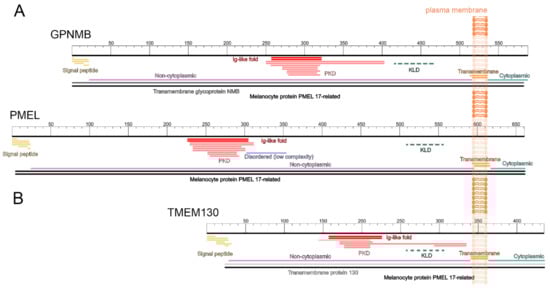 Despite being predicted homologs, the MUSCLE alignment of the full-length human sequences (Tables S1 and S2) demonstrated the limited sequence identity of PMEL to the other members at either the cDNA level (38.7% vs. TMEM130 and 33.2% vs. GPNMB) or the protein level (13.7% vs. TMEM130 and 24.9% vs. GPNMB). We therefore opted to investigate the similarities at the level of the shared domain architecture. The sequences for human TMEM130 (ENST00000416379.6), GPNMB (ENST00000647578.1) and PMEL (ENST00000548493.5) proteins were run through InterPro Scan to identify the functional domains based on the database signatures [95]. As expected, the GPNMB and PMEL proteins displayed a conserved protein domain architecture: (1) an N-terminal secretory pathway targeting signal (signal peptide, SP), (2) a large non-cytoplasmic (luminal) region containing an immunoglobulin-like polycystic kidney domain (PKD) and (3) a single Type I transmembrane domain with a short, C-terminal cytosolic domain (Figure 3A and Table S3).