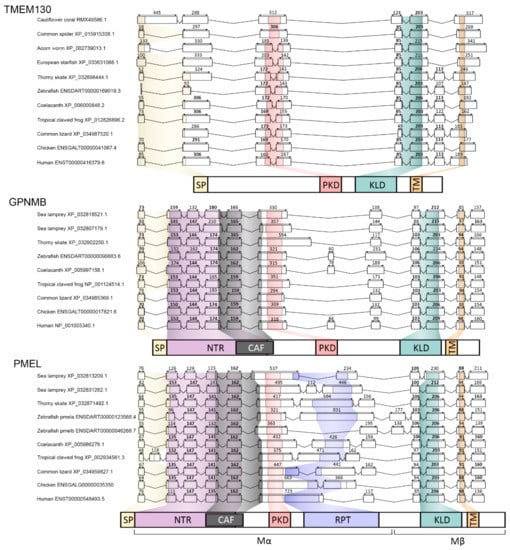 The following are available online: Figure S1: Gene synteny analysis of the pmel and gpnmb inparalogs in lamprey. Figure S2: Clade representative alignments of the tmem130 KLD. Figure S3: Cladogram of the mammalian RPT domains. Figure S4: Cladogram showing avian species Pmel RPT domains. Figure S5: Cladogram showing the amphibian and reptile Pmel RPT domains. Figure S6: Cladogram showing the fish Pmel RPT domain. Table S1: Percentage sequence similarity of the human PTHR11861 members at the cDNA level. Table S2: Percentage sequence similarity of the human PTHR11861 members at the protein level. Table S3: Functional domains predicted in human TMEM130 (ENST00000416379.6), GPNMB (ENST00000647578.1) and PMEL (ENST00000548493.5) by the InterPro server. Table S4: Clade-representative paralog sequences used. Table S5: Paralogous genes from humans, chickens or thorny skate that were found in neighboring lamprey gpnmb, pmel-like, pmel or gpnmb-like. Table S6: Additional PMEL paralog sequences used for the RPT domain predictions.