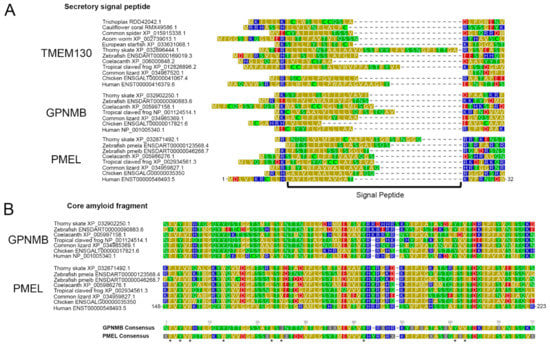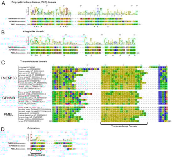 Despite the poor overall sequence conservation between the PKAT family proteins, several functional domains have been described as being well-conserved between PMEL and GPNMB [1]. The conservation of functional domains is suggestive of a common function within the cell; however, as discussed in the introduction, there has been a dearth of studies that demonstrate that the two proteins function within the same pathway. Furthermore, nothing has been published about the role of TMEM130 in the cell. To interrogate the conserved and divergent domains of the family, we performed multiple sequence alignments of clade-representative sequences. Firstly, the presumptive signal peptides (SPs) from our clade representatives display little sequence homology, as expected for a nonstructural determinant of the protein function [124]. Instead, we observed a stretch of eight or more amino acids with uncharged side chains, which were also rich in nonpolar side chains [125]. We determined that most of the outparalogs have a basic or acidic charged residue within 1–13 positions after the start methionine, followed by an easily detected SP of 7–33 residues long, before another basic or acidic residue appears (Figure 7A). The SP is cleaved from the mature protein in the ER once it has been translocated into the secretory pathway. Our alignment also revealed that there may be errors in the gene annotation of common lizard tmem130, where the start methionine of the sequence aligns downstream of the conserved position of SPs; correspondingly, its gene model lacks the “exon 1” that is annotated for all the other TMEM130s.