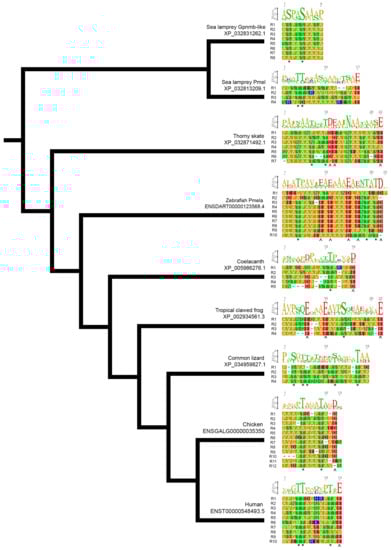 The glutamic acid residues in the Pmel RPT have been speculated to form hydrogen bonds similar to β-zippers of other amyloids in low-pH conditions [102]. However, the recently discovered accessory role of the PMEL RPT domain may instead implicate the regularly spaced, negatively charged residues with supporting the fibril arrangement of the amyloid. Evenly spaced glutamic acid/aspartic acid residues are a common feature of most (7/8) clade representative repeats (Figure 9), as well as most mammals (9/11) and fish (9/10) (Figures S3 and S6, Supplementary Materials). However, this pattern of [ED] ladders is rarely observed in bird (Figure S4) and reptile (Figure S5) species, even when negatively charged residues are present. More work is required to determine the functional significance of these negatively mammalian RPT domains.