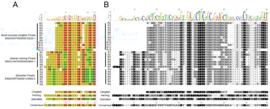 An interesting observation made during the analysis of the RPT domain sequences was that some species had near-perfect repeating protein sequences. For example, the RPT domain of zebrafish (Danio rerio), blunt-snouted clingfish (Gouania willdenowi) and Atlantic herring (Clupea harengus) each possess many repeat units that are almost perfectly identical in amino acid sequence within the species. However, comparing the near-perfect regions between species reveals that these closely related species underwent considerable sequence divergences (Figure 10A). We therefore examined these species in more detail at the amino acid and nucleotide levels to determine whether the evolutionary mechanisms could be deduced from the sequences. Firstly, the repeat unit numbers are different between all three species, suggesting an expansion or contraction of the tandem repeats after their divergence. Secondly, the lengths of the repeats are different between species, with a 22-mer in zebrafish, a 17-mer in clingfish and 23-mer repeat in herring. This variability cannot be explained at the DNA level by a frameshift event (since the motif V/A DAAA is common to all three species; a frameshift would shift the codon and disrupt this motif in subsequent repeats). Instead, each clingfish repeat lacks a total of 15 nucleotides per unit at the beginning of each repeat and a 3-bp deletion surrounded by a highly conserved GATGC motif upstream and GCT motif downstream that is found in 23/25 of the repeats (Figure 10B). For these nucleotides to have been deleted in clingfish (or inserted in herring and zebrafish), these mutations would have had to occur multiple times over (once per repeat unit). A more parsimonious explanation is therefore that these changes occurred after the divergence of these species from the last common ancestor but before there was expansion of the number of repeat units. Alternatively, it could be explained by very strong purifying/positive selection pressure to return to a uniform repeat unit length and consistent sequence. This area of the genome could also be particularly prone to DNA duplication, gene conversion and mobile elements of unequal recombination/crossing over events.
